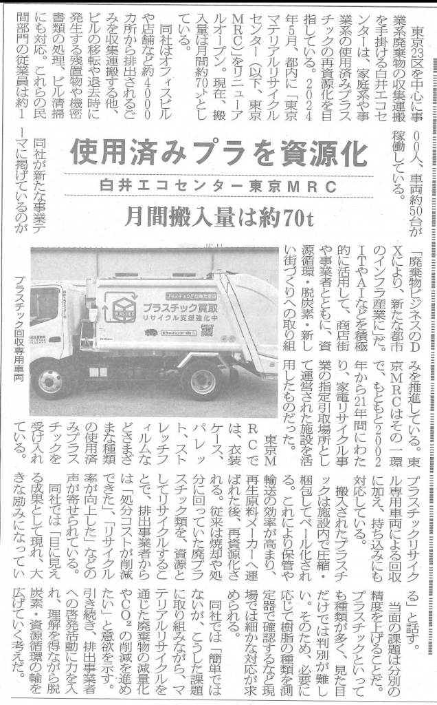 【ESJ関東/東京】白井エコセンター株式会社が循環経済新聞に掲載されました。