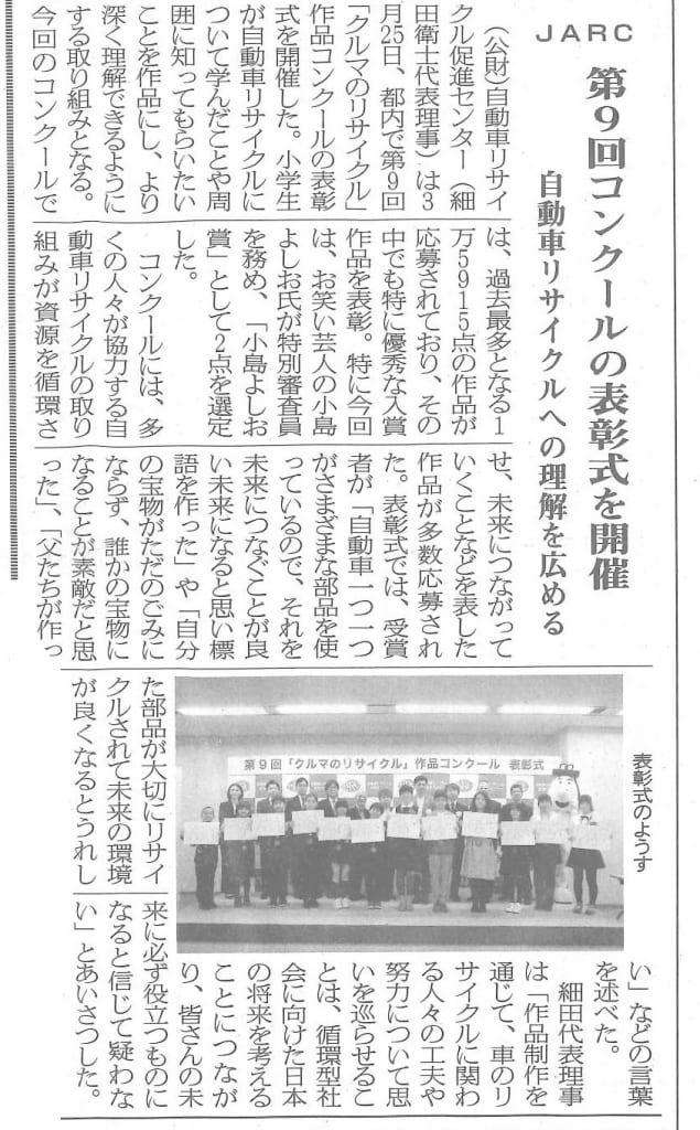 「JARC 第9回コンクールの表彰式を開催 -自動車リサイクルへの理解を広める-」循環経済新聞 1768号(3)